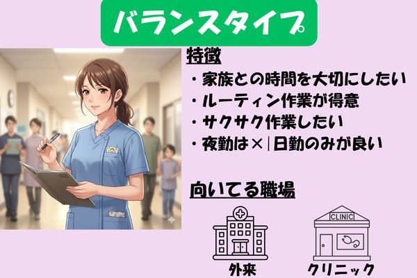 - 安定重視タイプ → 日勤のみの外来・クリニックが合いやすい